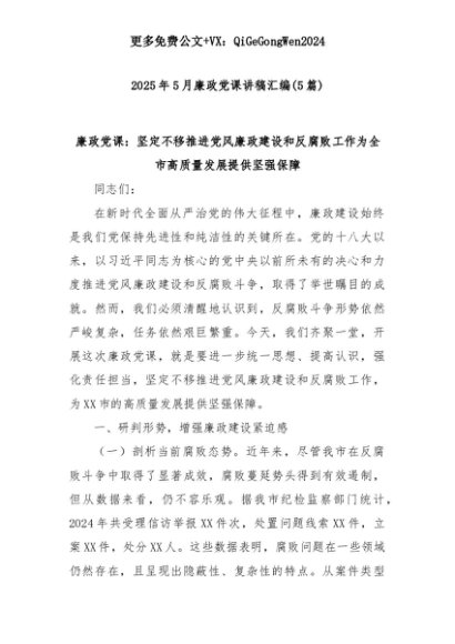 【七哥公文】2025年:【七哥公文】(5篇)2025年5月廉政党课讲稿汇编+更多免费公文+VX:QiGeGongWen2024+更多免费公文+VX:QiGeGongWen2024