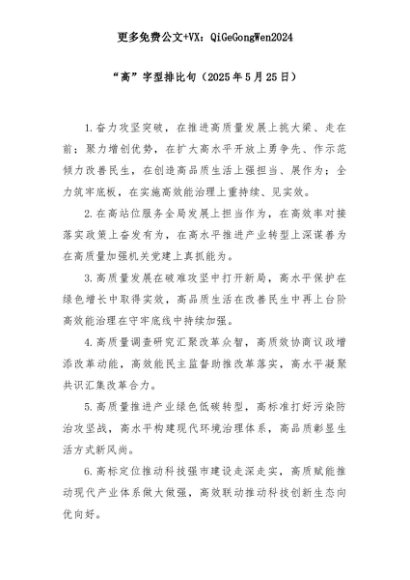 【七哥公文】2025年:【七哥公文】“高”字型排比句(2025年5月25日)+更多免费公文+VX:QiGeGongWen2024+更多免费公文+VX:QiGeGongWen2024