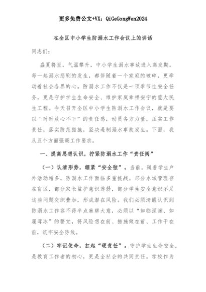 【七哥公文】2025年:在全区中小学生防溺水工作会议上的讲话+更多免费公文+VX:QiGeGongWen2024+更多免费公文+VX:QiGeGongWen2024