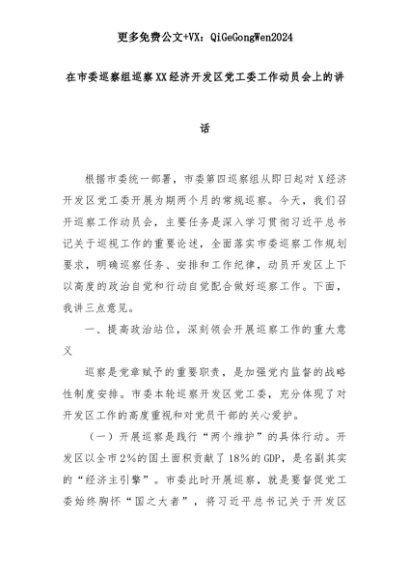 【七哥公文】2025年:在市委巡察组巡察XX经济开发区党工委工作动员会上的讲话+更多免费公文+VX:QiGeGongWen2024+更多免费公文+VX:QiGeGongWen2024