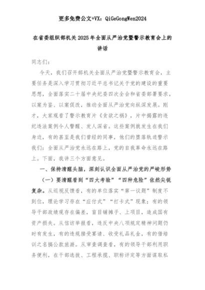 【七哥公文】2025年:在省委组织部机关2025年全面从严治党暨警示教育会上的讲话+更多免费公文+VX:QiGeGongWen2024+更多免费公文+VX:QiGeGongWen2024