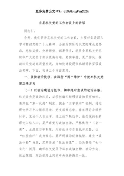 【七哥公文】2025年:在县机关党的工作会议上的讲话+更多免费公文+VX:QiGeGongWen2024+更多免费公文+VX:QiGeGongWen2024
