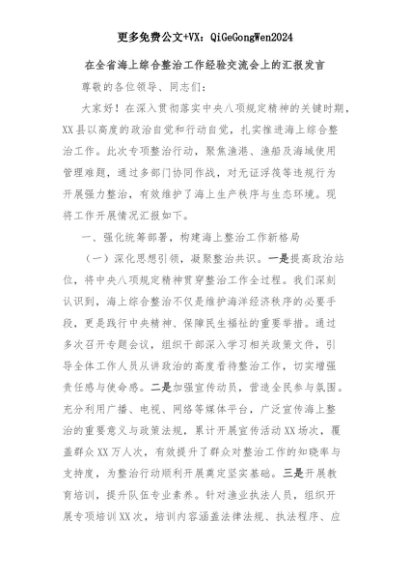 【七哥公文】2025年:在全省海上综合整治工作经验交流会上的汇报发言+更多免费公文+VX:QiGeGongWen2024+更多免费公文+VX:QiGeGongWen2024