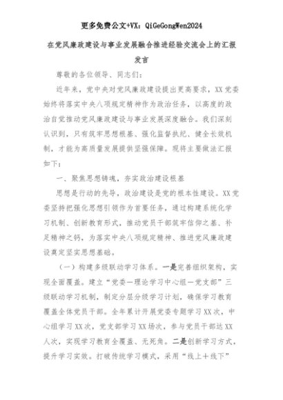 【七哥公文】2025年:在党风廉政建设与事业发展融合推进经验交流会上的汇报发言+更多免费公文+VX:QiGeGongWen2024+更多免费公文+VX:QiGeGongWen2024