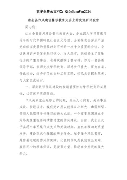 【七哥公文】2025年:在全县作风建设警示教育大会上的交流研讨发言+更多免费公文+VX:QiGeGongWen2024+更多免费公文+VX:QiGeGongWen2024