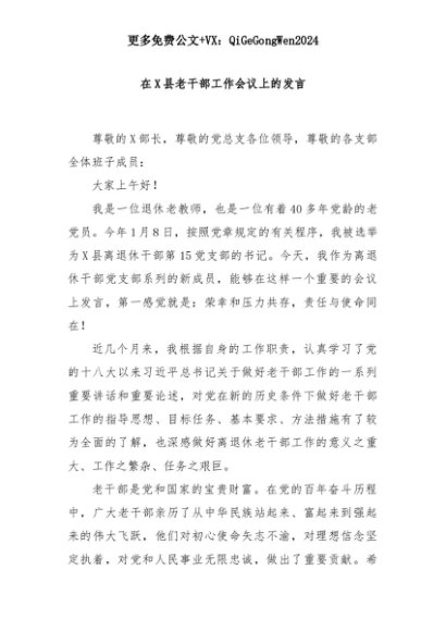 【七哥公文】2025年:在X县老干部工作会议上的发言+更多免费公文+VX:QiGeGongWen2024+更多免费公文+VX:QiGeGongWen2024