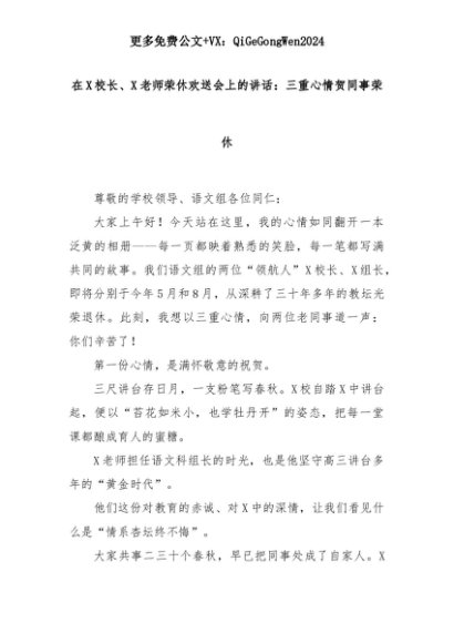 【七哥公文】2025年:在X校长、X老师荣休欢送会上的讲话:三重心情贺同事荣休+更多免费公文+VX:QiGeGongWen2024+更多免费公文+VX:QiGeGongWen2024