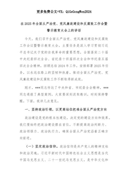【七哥公文】2025年:在2025年全面从严治党、党风廉政建设和反腐败工作会暨警示教育大会上的讲话+更多免费公文+VX:QiGeGongWen2024+更多免费公文+VX:QiGeGongWen2024