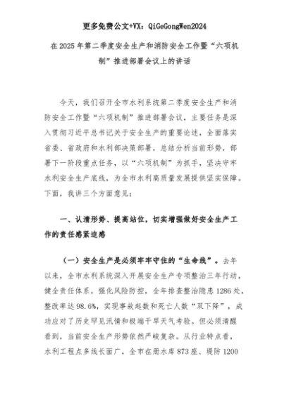【七哥公文】2025年:在2025年第二季度安全生产和消防安全工作暨“六项机制”推进部署会议上的讲话+更多免费公文+VX:QiGeGongWen2024+更多免费公文+VX:QiGeGongWen2024