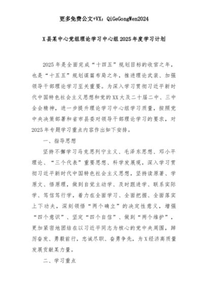 【七哥公文】2025年:X县某中心党组理论学习中心组2025年度学习计划+更多免费公文+VX:QiGeGongWen2024+更多免费公文+VX:QiGeGongWen2024