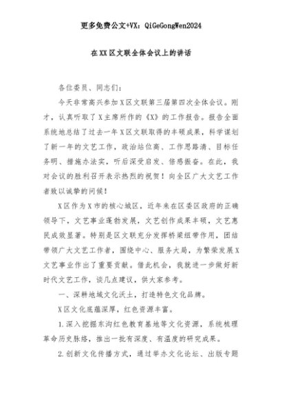 【七哥公文】2025年:在XX区文联全体会议上的讲话+更多免费公文+VX:QiGeGongWen2024+更多免费公文+VX:QiGeGongWen2024