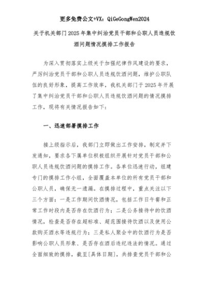 【七哥公文】2025年:关于机关部门2025年集中纠治党员干部和公职人员违规饮酒问题情况摸排工作报告+更多免费公文+VX:QiGeGongWen2024+更多免费公文+VX:QiGeGongWen2024