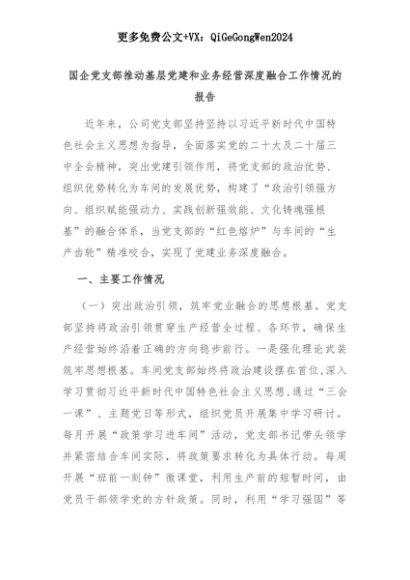 【七哥公文】2025年:国企党支部推动基层党建和业务经营深度融合工作情况的报告+更多免费公文+VX:QiGeGongWen2024+更多免费公文+VX:QiGeGongWen2024