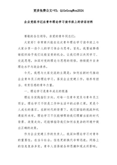 【七哥公文】2025年:企业党组书记在青年理论学习读书班上的讲话材料+更多免费公文+VX:QiGeGongWen2024+更多免费公文+VX:QiGeGongWen2024