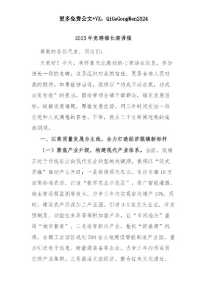 【七哥公文】2025年:2025年竞聘镇长演讲稿+更多免费公文+VX:QiGeGongWen2024+更多免费公文+VX:QiGeGongWen2024