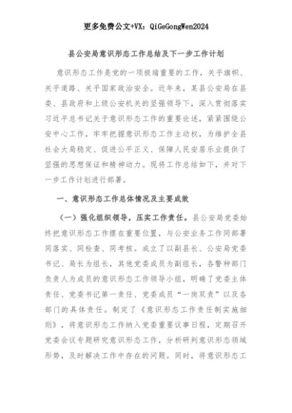 【七哥公文】2025年:县公安局意识形态工作总结及下一步工作计划+更多免费公文+VX:QiGeGongWen2024+更多免费公文+VX:QiGeGongWen2024