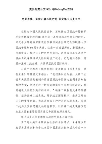 【七哥公文】2025年:党课讲稿:坚持正确二战史观 坚定捍卫历史正义+更多免费公文+VX:QiGeGongWen2024+更多免费公文+VX:QiGeGongWen2024