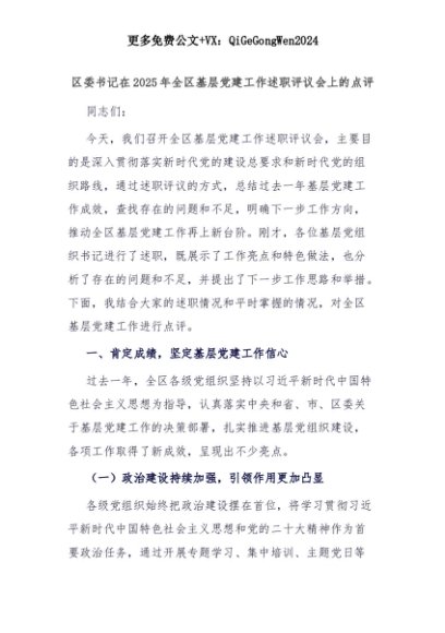 【七哥公文】2025年:区委书记在2025年全区基层党建工作述职评议会上的点评+更多免费公文+VX:QiGeGongWen2024+更多免费公文+VX:QiGeGongWen2024