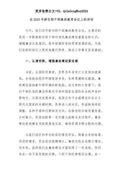 【七哥公文】2025年:在2025年新任职干部廉政教育会议上的讲话+更多免费公文+VX:QiGeGongWen2024+更多免费公文+VX:QiGeGongWen2024
