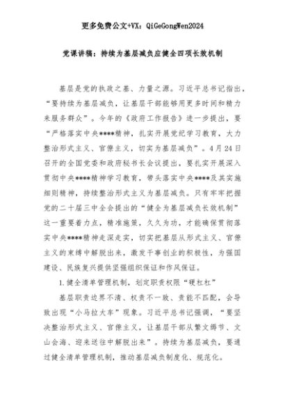 【七哥公文】2025年:党课讲稿:持续为基层减负应健全四项长效机制+更多免费公文+VX:QiGeGongWen2024+更多免费公文+VX:QiGeGongWen2024