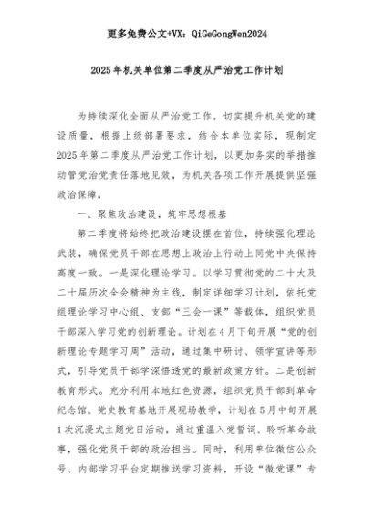 【七哥公文】2025年:2025年机关单位第二季度从严治党工作计划+更多免费公文+VX:QiGeGongWen2024+更多免费公文+VX:QiGeGongWen2024