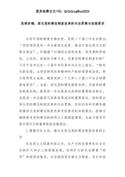 【七哥公文】2025年:党课讲稿:深化党的建设制度改革的内在逻辑与实践要求+更多免费公文+VX:QiGeGongWen2024+更多免费公文+VX:QiGeGongWen2024