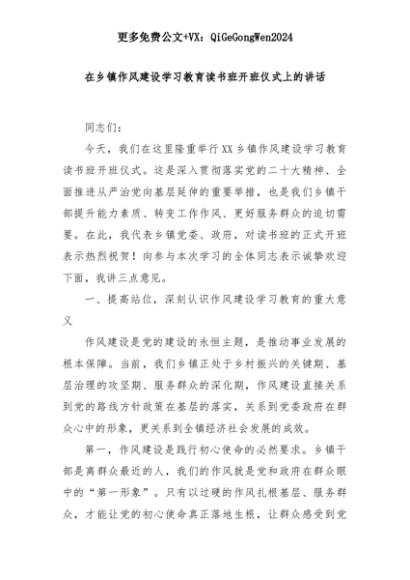 【七哥公文】2025年:在乡镇作风建设学习教育读书班开班仪式上的讲话+更多免费公文+VX:QiGeGongWen2024+更多免费公文+VX:QiGeGongWen2024