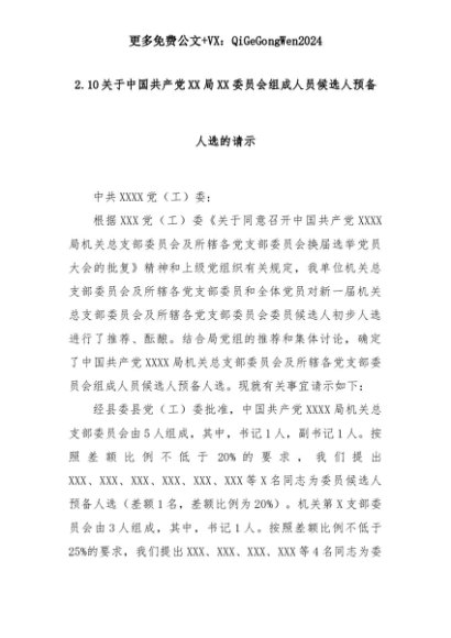 【七哥公文】2025年:2.10关于中国共产党XX局XX委员会组成人员候选人预备人选的请示+更多免费公文+VX:QiGeGongWen2024+更多免费公文+VX:QiGeGongWen2024