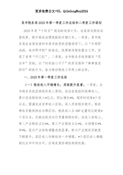 【七哥公文】2025年:某市税务局2025年第一季度工作总结和二季度工作谋划+更多免费公文+VX:QiGeGongWen2024+更多免费公文+VX:QiGeGongWen2024