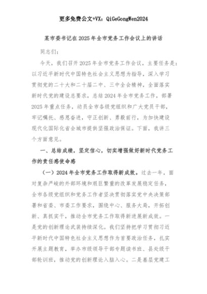 【七哥公文】2025年:某市委书记在2025年全市党务工作会议上的讲话+更多免费公文+VX:QiGeGongWen2024+更多免费公文+VX:QiGeGongWen2024