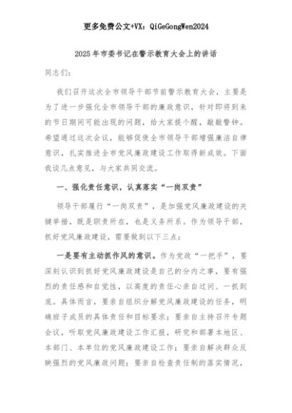 【七哥公文】2025年:2025年市委书记在警示教育大会上的讲话+更多免费公文+VX:QiGeGongWen2024+更多免费公文+VX:QiGeGongWen2024