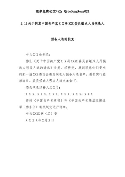 【七哥公文】2025年:2.11关于同意中国共产党X X局XXX委员组成人员候选人预备人选的批复+更多免费公文+VX:QiGeGongWen2024+更多免费公文+VX:QiGeGongWen2024