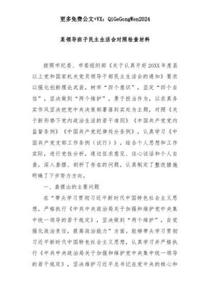 【七哥公文】2025年:某领导班子民主生活会对照检查材料+更多免费公文+VX:QiGeGongWen2024+更多免费公文+VX:QiGeGongWen2024