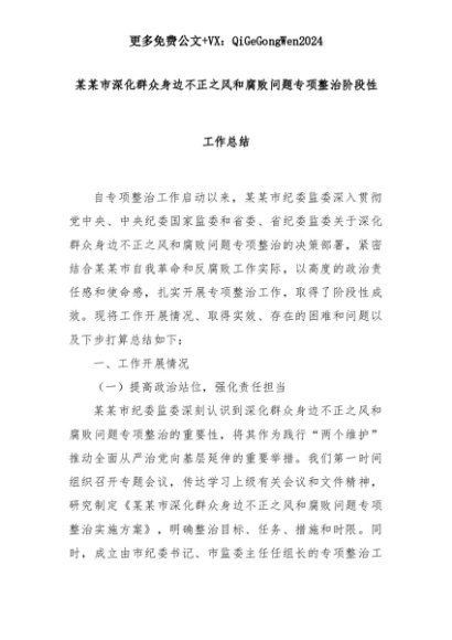 【七哥公文】2025年:某某市深化群众身边不正之风和腐败问题专项整治阶段性工作总结+更多免费公文+VX:QiGeGongWen2024+更多免费公文+VX:QiGeGongWen2024