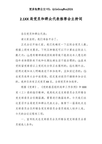 【七哥公文】2025年:2.1XX局党员和群众代表推荐会主持词+更多免费公文+VX:QiGeGongWen2024+更多免费公文+VX:QiGeGongWen2024