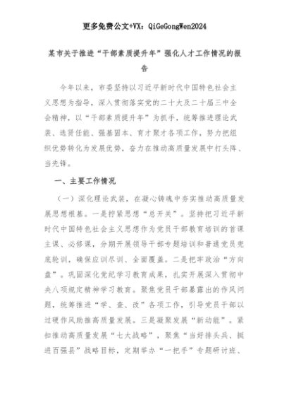 【七哥公文】2025年:某市关于推进“干部素质提升年”强化人才工作情况的报告+更多免费公文+VX:QiGeGongWen2024+更多免费公文+VX:QiGeGongWen2024