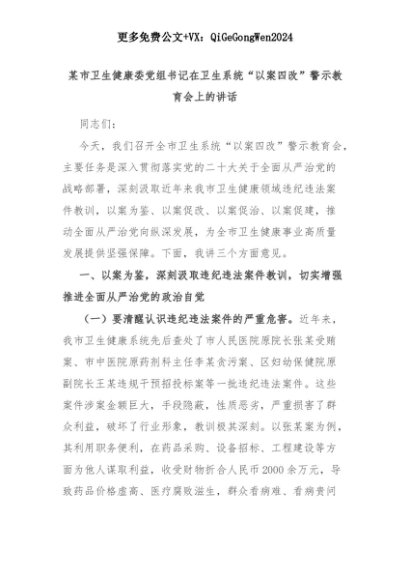 【七哥公文】2025年:某市卫生健康委党组书记在卫生系统“以案四改”警示教育会上的讲话+更多免费公文+VX:QiGeGongWen2024+更多免费公文+VX:QiGeGongWen2024