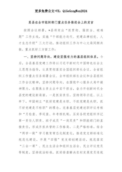 【七哥公文】2025年:某县在全市组织部门重点任务推进会上的发言+更多免费公文+VX:QiGeGongWen2024+更多免费公文+VX:QiGeGongWen2024