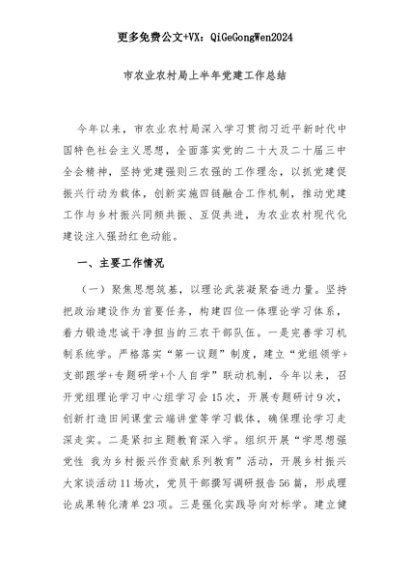 【七哥公文】2025年:市农业农村局上半年党建工作总结+更多免费公文+VX:QiGeGongWen2024+更多免费公文+VX:QiGeGongWen2024