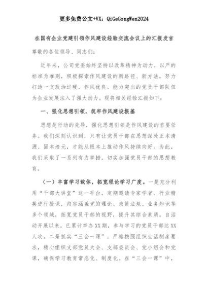 【七哥公文】2025年:在国有企业党建引领作风建设经验交流会议上的汇报发言+更多免费公文+VX:QiGeGongWen2024+更多免费公文+VX:QiGeGongWen2024