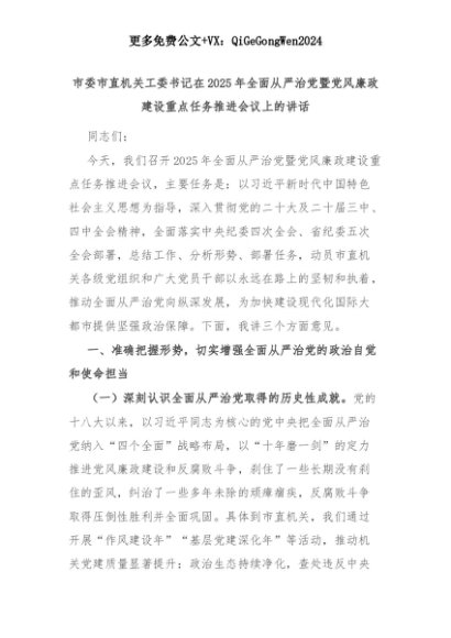 【七哥公文】2025年:市委市直机关工委书记在2025年全面从严治党暨党风廉政建设重点任务推进会议上的讲话+更多免费公文+VX:QiGeGongWen2024+更多免费公文+VX:QiGeGongWen2024