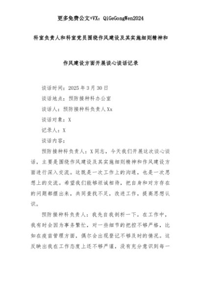 【七哥公文】2025年:科室负责人和科室党员围绕作风建设及其实施细则精神和作风建设方面开展谈心谈话记录+更多免费公文+VX:QiGeGongWen2024+更多免费公文+VX:QiGeGongWen2024