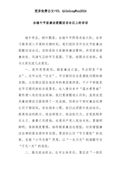 【七哥公文】2025年:在端午节前廉洁提醒谈话会议上的讲话+更多免费公文+VX:QiGeGongWen2024+更多免费公文+VX:QiGeGongWen2024