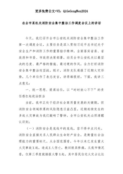 【七哥公文】2025年:在全市某机关消防安全集中整治工作调度会议上的讲话+更多免费公文+VX:QiGeGongWen2024+更多免费公文+VX:QiGeGongWen2024