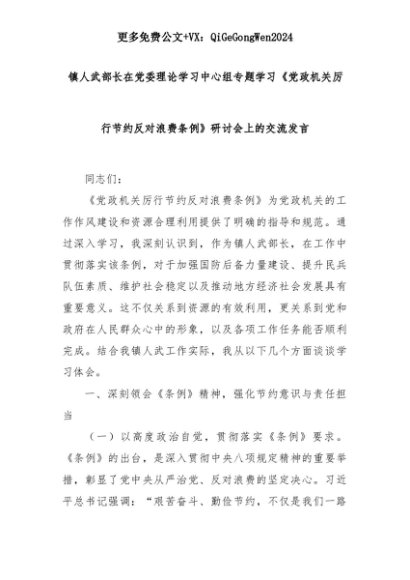 【七哥公文】2025年:镇人武部长在党委理论学习中心组专题学习《党政机关厉行节约反对浪费条例》研讨会上的交流发言+更多免费公文+VX:QiGeGongWen2024+更多免费公文+VX:QiGeGongWen2024