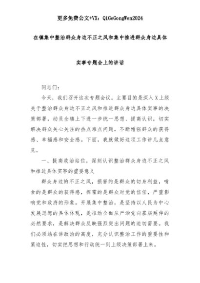 【七哥公文】2025年:在镇集中整治群众身边不正之风和集中推进群众身边具体实事专题会上的讲话+更多免费公文+VX:QiGeGongWen2024+更多免费公文+VX:QiGeGongWen2024