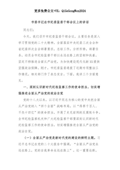 【七哥公文】2025年:市委书记在市纪委监委干部会议上的讲话+更多免费公文+VX:QiGeGongWen2024+更多免费公文+VX:QiGeGongWen2024