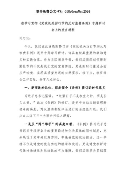 【七哥公文】2025年:在学习贯彻《党政机关厉行节约反对浪费条例》专题研讨会上的发言材料+更多免费公文+VX:QiGeGongWen2024+更多免费公文+VX:QiGeGongWen2024
