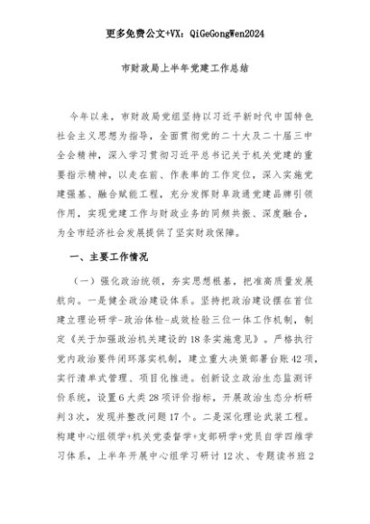 【七哥公文】2025年:市财政局上半年党建工作总结+更多免费公文+VX:QiGeGongWen2024+更多免费公文+VX:QiGeGongWen2024