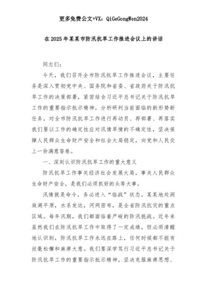 【七哥公文】2025年:在2025年某某市防汛抗旱工作推进会议上的讲话+更多免费公文+VX:QiGeGongWen2024+更多免费公文+VX:QiGeGongWen2024